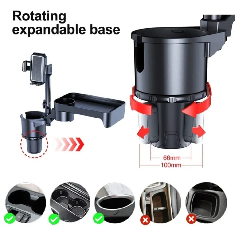 β Expandable Cup Base: The base expands from 66mm to 100mm, ensuring a rock-solid fit in almost any vehicle’s standard cup holder. Simply twist to lock it securely in place.