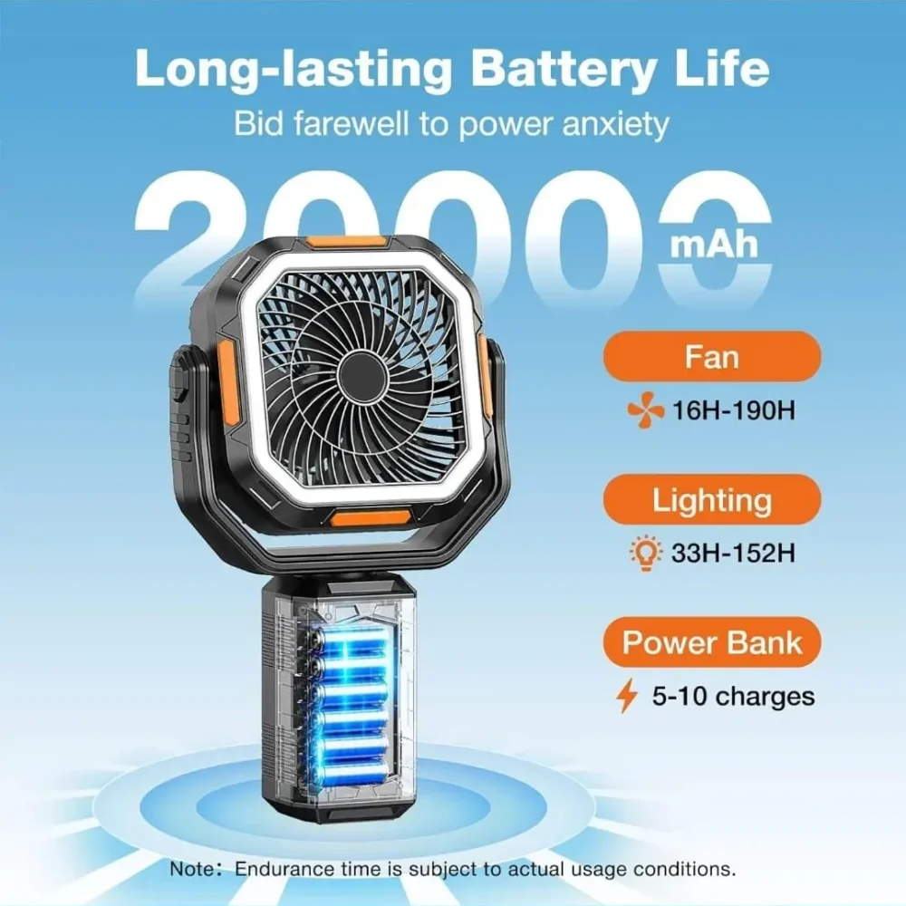 🔋 Massive 20,000mAh Battery & Power Bank: Say goodbye to power anxiety. Enjoy up to 190 hours of fan runtime or 152 hours of lighting on a single charge. Plus, the built-in USB port works as a power bank to charge your phone 5-10 times in an emergency.