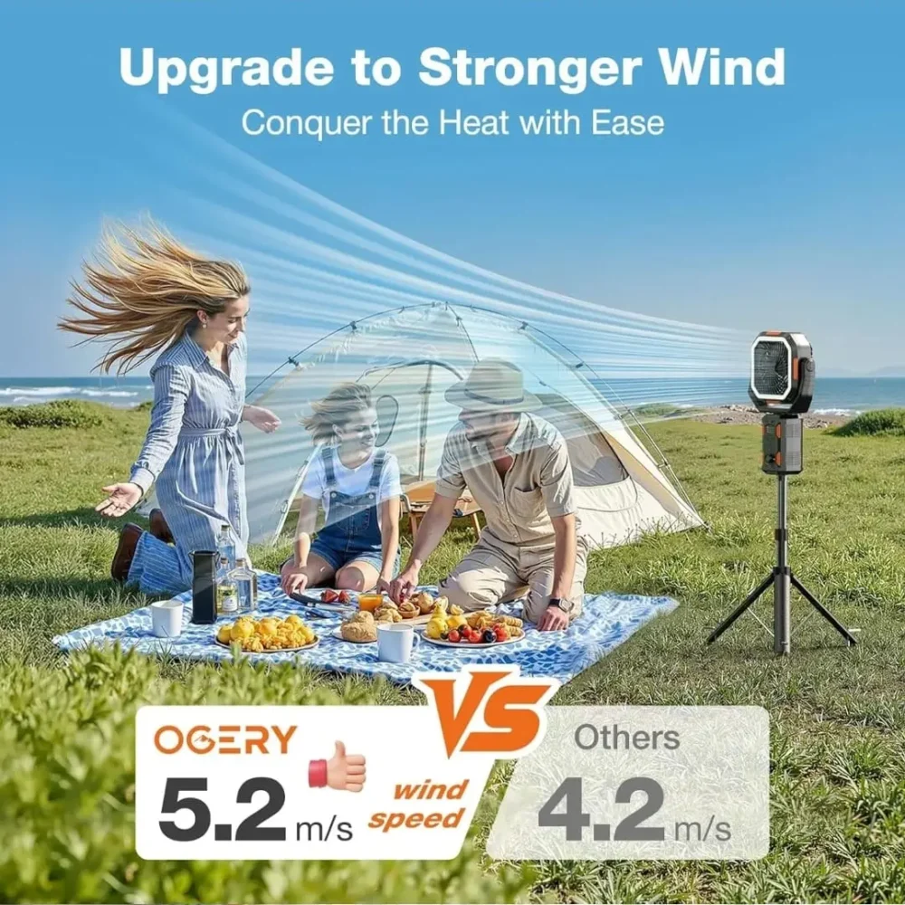 Conquer the heat and light up your nights with the OGERY F21 Camping Fan. Designed for the outdoors but perfect for the home, this powerhouse combines a high-velocity fan, a bright camping lantern, and a massive power bank into one portable unit. Whether you are camping, at the beach, or trying to get a baby to sleep, this fan adapts to your needs.