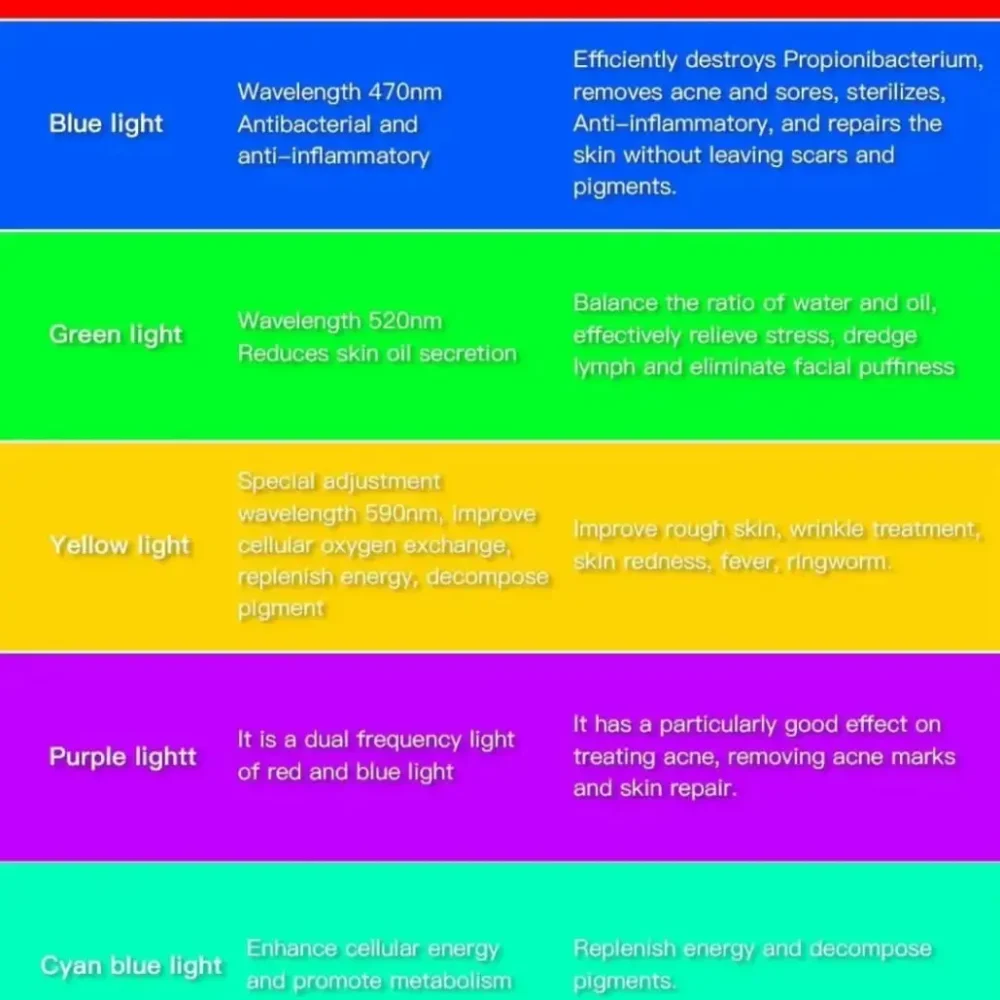 🟣 Purple Light: A dual-frequency combo of Red and Blue light, perfect for repairing acne marks and healing.