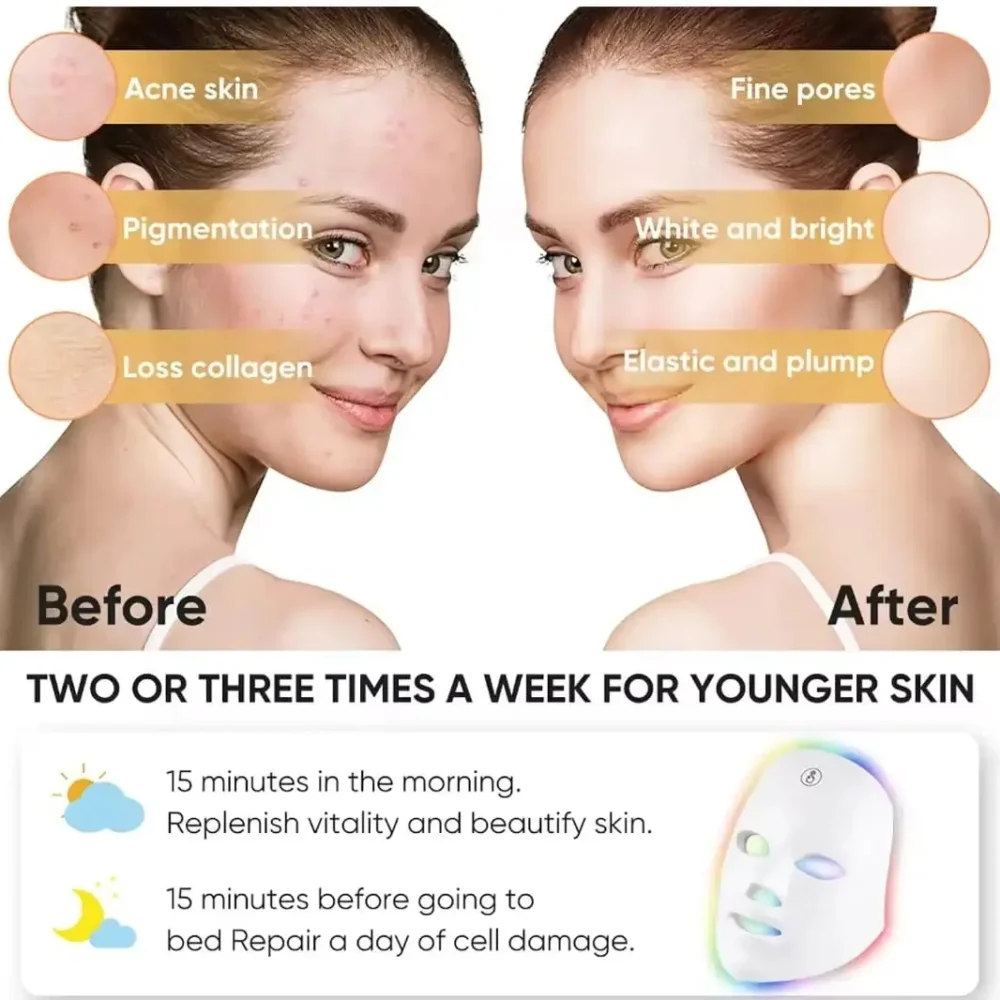 Bring the luxury of a professional spa directly to your home with our 7-Color LED Light Therapy Mask. Engineered with 90 high-intensity LED bulbs, this wireless device uses specific light wavelengths to target distinct skin concerns, from acne and redness to fine lines and dullness.